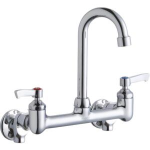 Elkay 8” Centerset Wall Mount Faucet W/3” Bucket Hook Spt 4in Wristblade Handles 1/2” Offset Inlet Polished