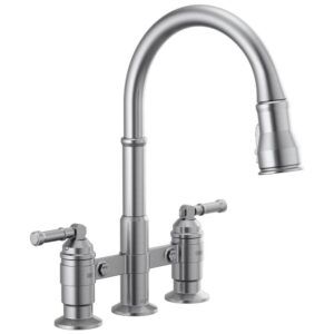 The powerful features of the Broderick Collection take center stage in the kitchen, with an industrial style that alludes to a rich heritage. The collection includes distinctive bridge faucet and pull-down spring spout faucet options that add a unique element to any kitchen. Styled after the rugged nuts and bolts of machinery, it serves as a true centerpiece in the kitchen. Kitchen sink faucets with Touch-Clean Spray Holes allow you to easily wipe away calcium and lime build-up with the touch of a finger. Delta ShieldSpray Technology cleans with laser-like precision while containing mess and splatter. A concentrated jet powers away stubborn messes while an innovative shield of water contains splatter and clears off the mess, so you can spend less time soaking, scrubbing and shirt swapping. Delta kitchen faucets with DIAMOND Seal Technology perform like new for life with a patented design which reduces leak points, is less hassle to install and lasts twice as long as the industry standa