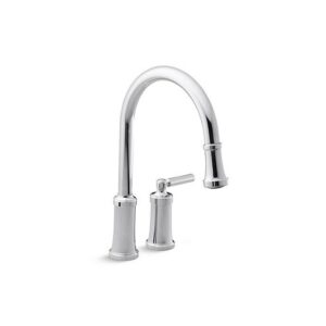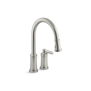 Compact three-function sprayhead allows user to choose between spray, aerated flow and pause functions; seamless spout reaches 9 7/8"