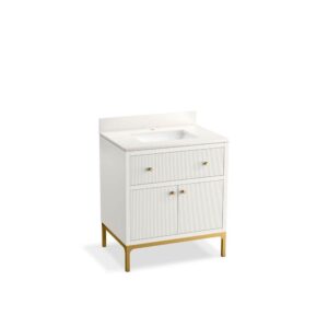 The KOHLER Calpa all-in-one vanity is sleek and modern with a linear design. Reeding details add an intricate texture to the cabinetry. The two-door cabinet offers plenty of storage space and an adjustable shelf to neatly keep your personal care items organized. This 30” freestanding single sink vanity set includes a two-door cabinet with soft-close hinges, tip-out drawer for smaller items, quartz countertop with matching backsplash, sink, and cabinet hardware in Brushed Brass.