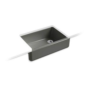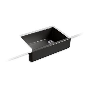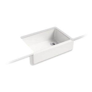 The KOHLER Whitehaven apron-front kitchen sink features a streamlined and versatile farmhouse style to complement any decor. A large single basin accommodates large pots and pans, while the sloped bottom helps with draining and cleanup. Crafted from enameled cast iron, this sink resists chipping, cracking, or burning for years of beauty and reliable performance. A standard apron front makes it easy to install on 33-inch apron-front cabinetry. The Self-Trimming design requires only a simple rough cut, overlapping the cabinet face for beautiful results.