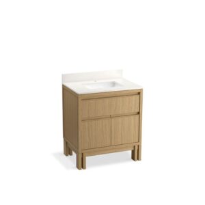 The KOHLER Solive vanity collection is both timeless and minimal in design. The two-door cabinet offers plenty of storage space and an adjustable shelf to neatly keep your personal care items organized. This 30” single sink vanity set includes a two-door cabinet with soft-close hinges, quartz countertop with matching backsplash, sink, and uniquely integrated cabinet pulls that are created by a traditional Japanese joinery technique.