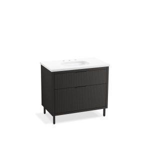 Vanity top provides complete overhanging coverage of cabinetry