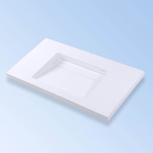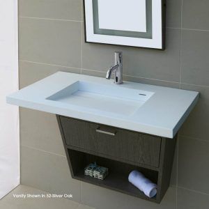 Wall-mount or vanity-top Bathroom Sink made of solid surface with an overflow and decorative drain cover. It requires brackets for wall-mount installation, with 00 – no faucet holes, 01 – one faucet hole, 02 – two faucet holes (center and right) or 03 – three faucet holes in 8” spread. W: 34”, D: 18”, H: 3”.
