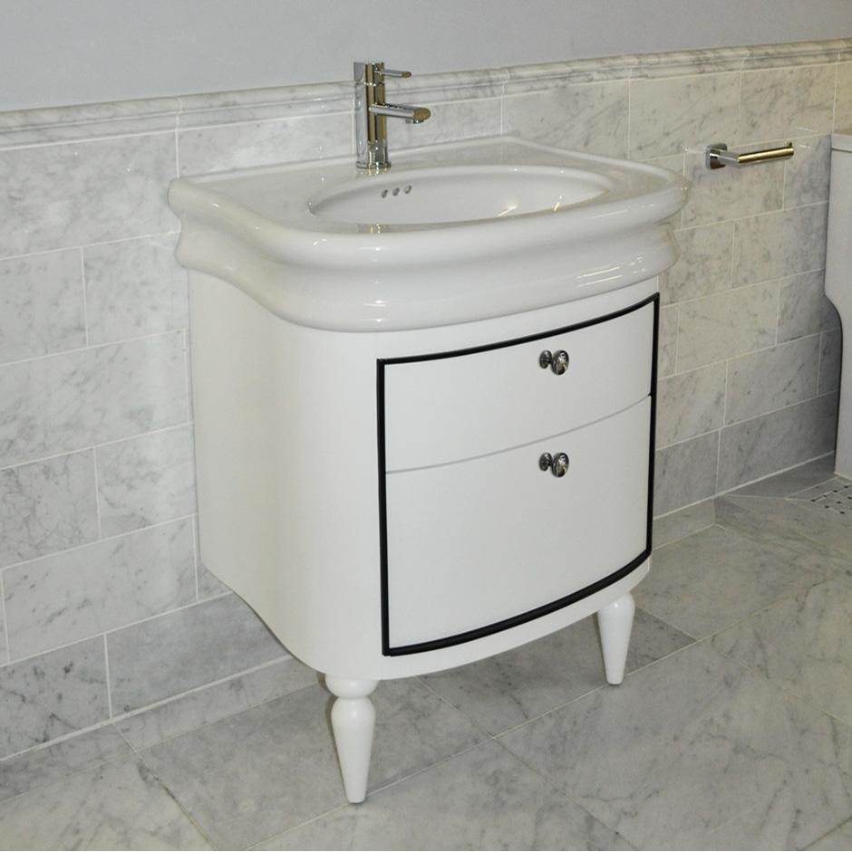 Wall-mount under-counter vanity with two drawers. The top drawer has U-shape notch for plumbing. Polished chrome pulls included. H25 legs and H251 Bathroom Sink sold separtely. W: 24 1/2”, D: 19 1/2”, H: 19 1/2”